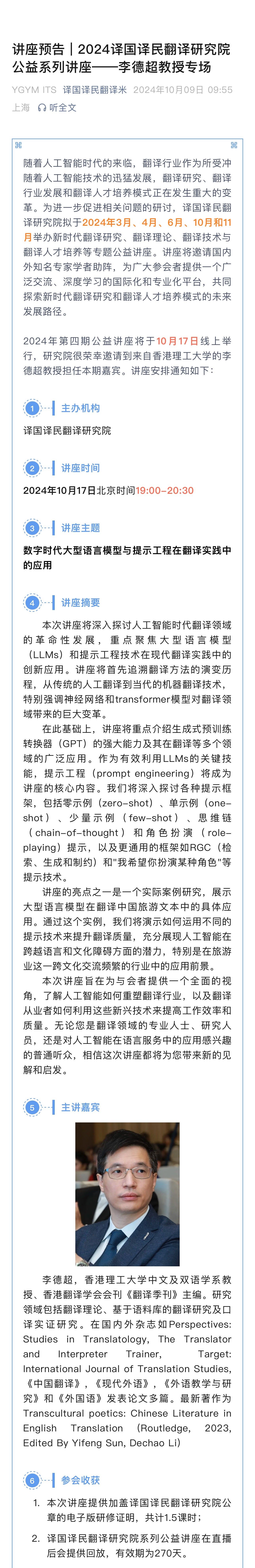 具体信息见链接:讲座预告| 2024译国译民翻译研究院公益系列讲座——李德超教授专场https://mp.weixin.qq.com/s/Mg003vUpxJukWuvsk_r3zQ