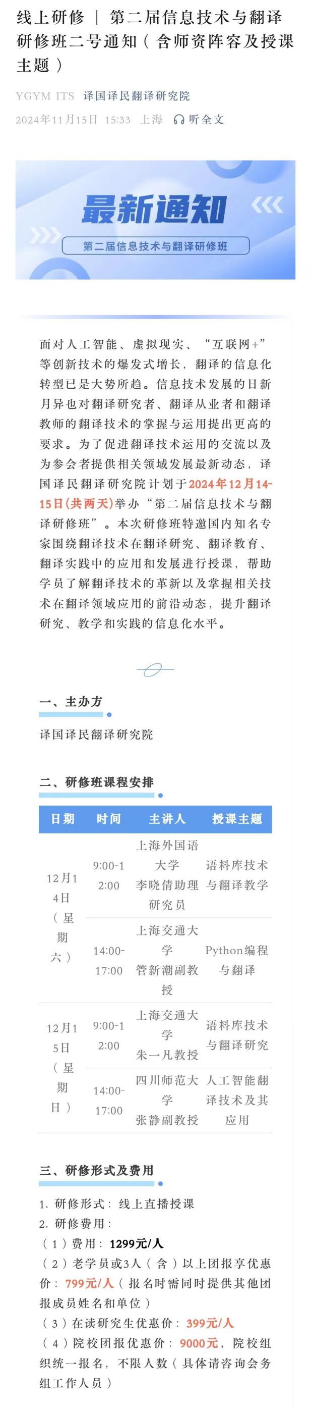 具体信息见链接:线上研修|第二届信息技术与翻译研修班二号通知(含师资阵容及授课主题)https://mp.weixin.qq.com/s/ndQKxsRX8Du448dNQ0HBjw