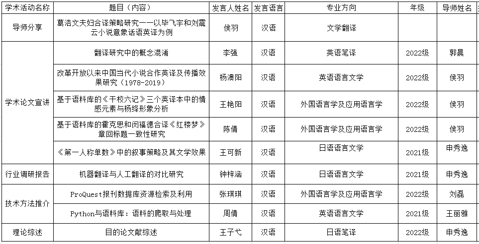 为促进我院研究生学术交流,活跃学术氛围,拓宽学术视野,激励学术创新,我院继第一期后继续开展硕士研究生学术论坛系列活动第二期,本期活动分为“导师分享”、“学术论文宣讲”、“行业调研报告”、“技术方法推荐”、“理论综述”五大模块。本期汇报为导师1人,研究生9人。采用主题宣讲和师生互动形式进行。欢迎各位导师和同学踊跃参与交流。
