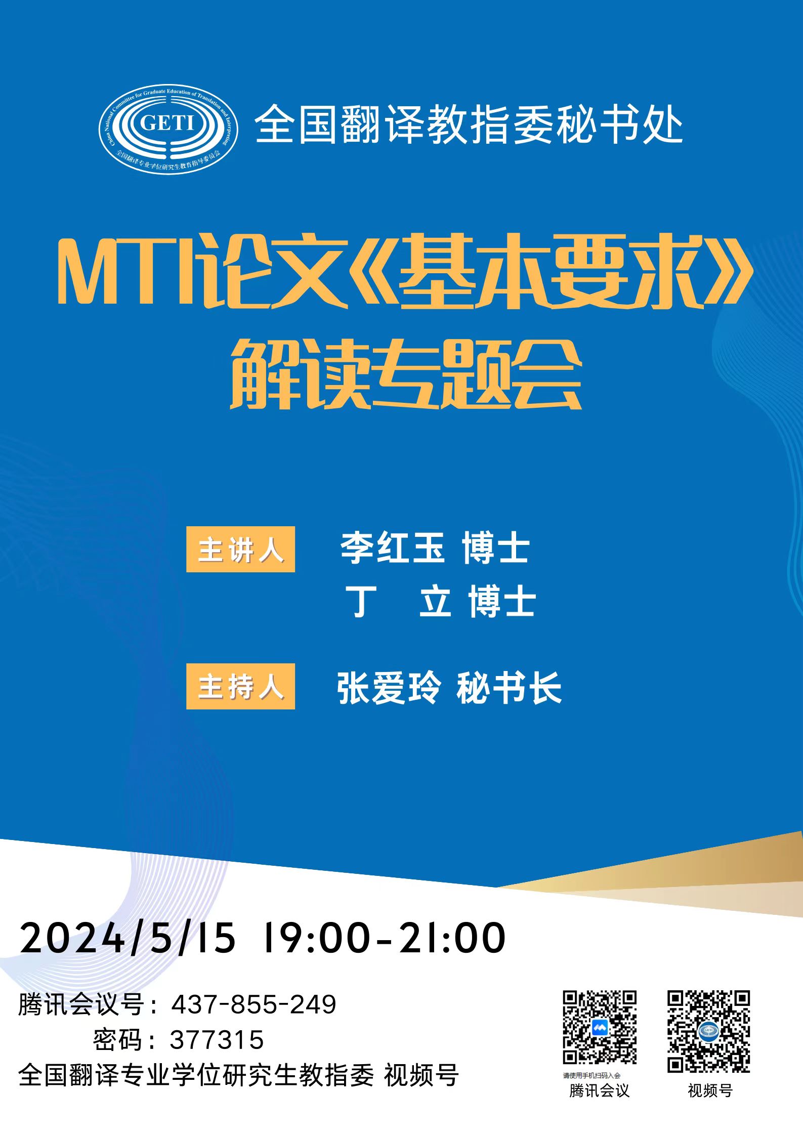 全国翻译专业硕士研究生教指委日前发布了《翻译专业学位类别硕士学位论文基本要求(试行)》。为了推动我院MTI建设,提升硕士研究生培养质量,把好论文出口关,了解和贯彻新的基本要求,请全体导师于2024年5月15日19时参加线上解读专题会。