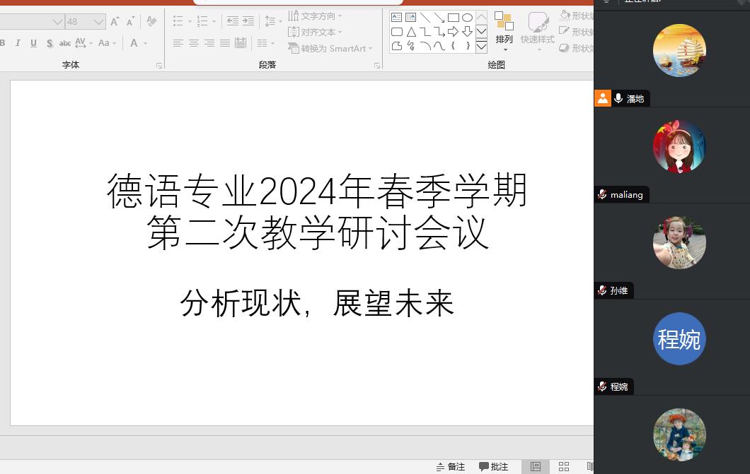会议伊始,潘地老师简要介绍了本次会议的背景和目的。随后,与会教师围绕德语专业的课程体系、教学质量、师资力量、实习基地建设等方面进行了深入研讨。