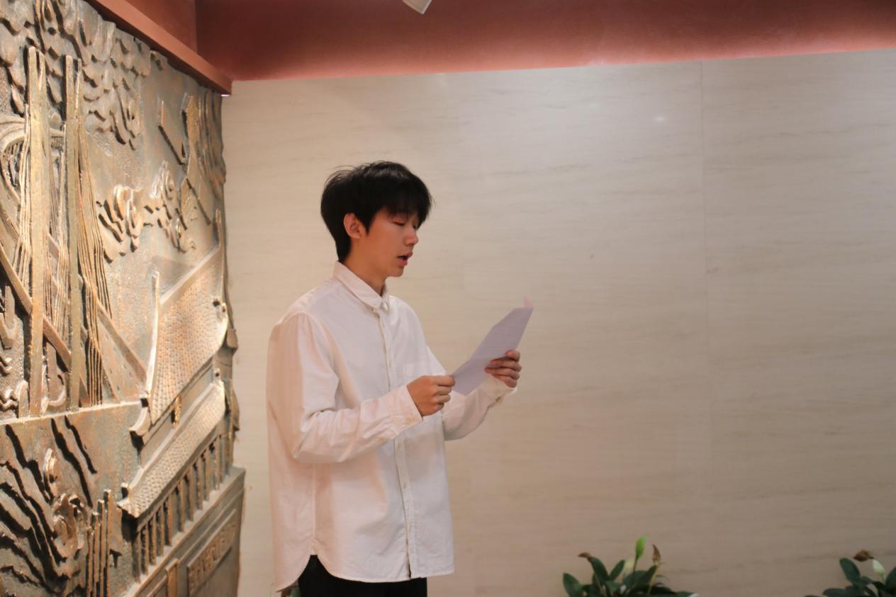 仪式第二项,研究生代表常洋同志作为新发展预备党员代表进行发言。他表达了对党组织培养的感激之情以及加入党组织的光荣感和自豪感,深知作为一名预备党员,未来的道路充满了学习和挑战,自己将始终保持初心,不断学习党的理论和实践,把入党誓词作为自己终身的追求、终身的修养和终身的实践,以实际行动践行对党的承诺。