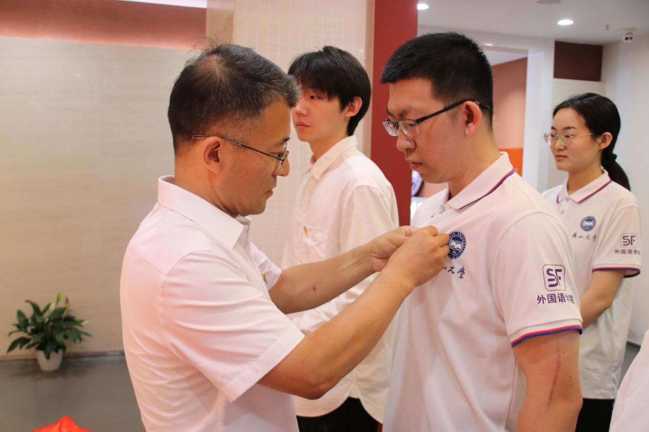 仪式第三项,院党委书记屈晓阳、党委副书记夏亮亮为新发展党员佩戴党员党徽,向新发展的党员同志们表示祝贺。