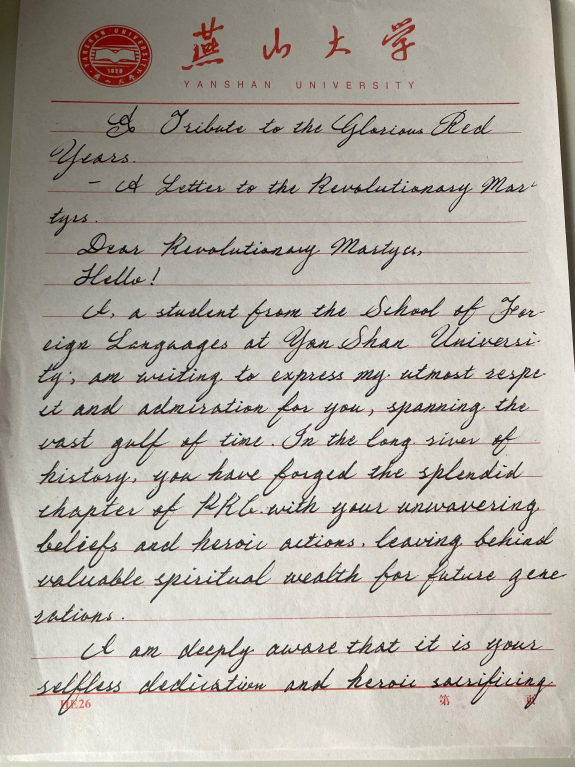 本次“跨越时空的对话——致革命先辈的一封信”征文比赛设置中文组和外文组两个赛道,吸引了8个学院同学积极参与、踊跃投稿。参赛的征文作品主题鲜明、内容充实、形式新颖、情真意切,不仅表达了当代青年对革命先辈的感恩缅怀之情,也展现了燕大学子昂扬向上的精神风貌和爱国报国的拳拳之心。本次大赛共收到投稿120余篇,按照大赛规则,经评委组评分后按照提交作品比例评选出中文组一等奖10人、二等奖10人、三等奖13人、优秀奖30人;外文组一等奖1人、二等奖2人、三等奖2人、优秀奖5人。