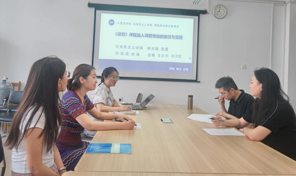 为进一步推进英语专业课程思政建设,实现《语音》课程思政内化于心、外化于行的效果,落实立德树人的根本任务,校级课程思政示范课程《语音》教学团队于2024年6月20日在人文馆318与马克思主义学院思政教师组织了课程思政与思政课程“双向融合”的联合备课活动。马克思主义学院杨元超、雷霆两位老师受邀出席,大外二系王珍珍和闫月贺老师参加了研讨。本次活动由边雅老师主持。