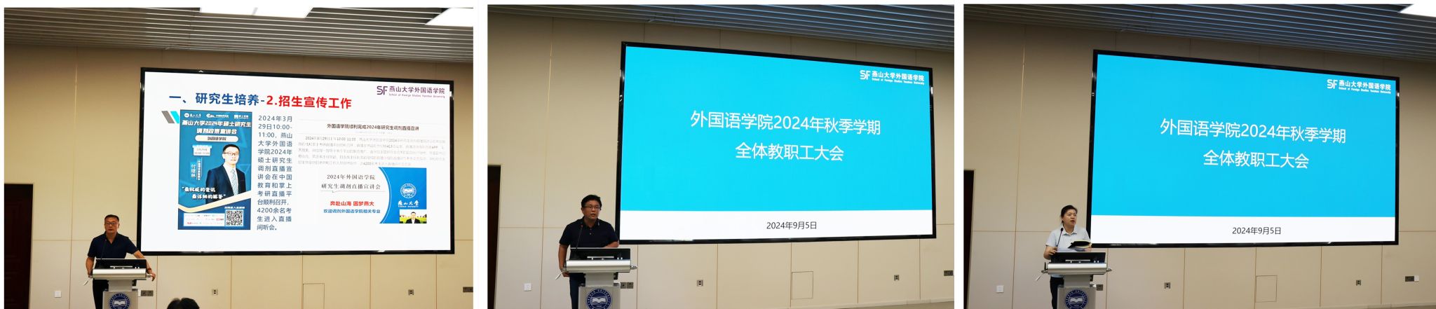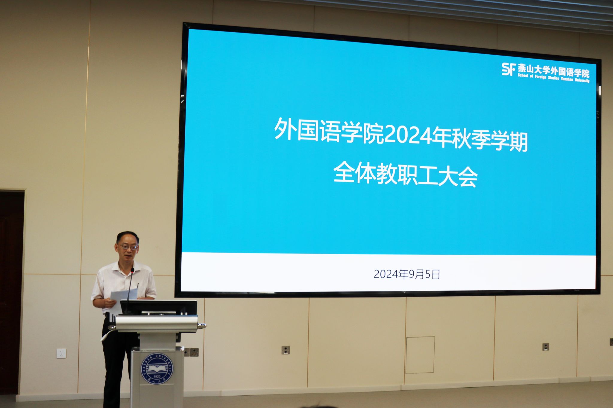 党委书记屈晓阳从党风廉政建设、师德师风建设、安全稳定工作、意识形态工作四方面提出了具体要求:一是要认真学习领会上级有关精神,不断提高思想认识和工作站位;二是要深入谋划和积极推进,狠抓末端最后一公里的贯彻和落实;三是要对安全稳定工作常抓不懈,为内涵式高质量发展营造和谐稳定的环境。随后,屈晓阳书记对全体教职工进行了安全教育培训,从国家安全、消防安全、防溺水、出行安全、用电安全、防诈骗六个方面开展安全宣传教育,提升教师安全防范能力。最后,屈晓阳书记希望全院教师尽快从假期休闲模式切换到紧张有序的工作模式,调整好工作、学习和生活的节奏,使身心迅速进入正常的工作状态,在校党委的坚强领导下,在学院党政领导带领下,拼搏实干、努力奋斗、奋勇争先,为学校加快推进“双一流”建设和学院内涵式高质量发展贡献我们外语人的力量!