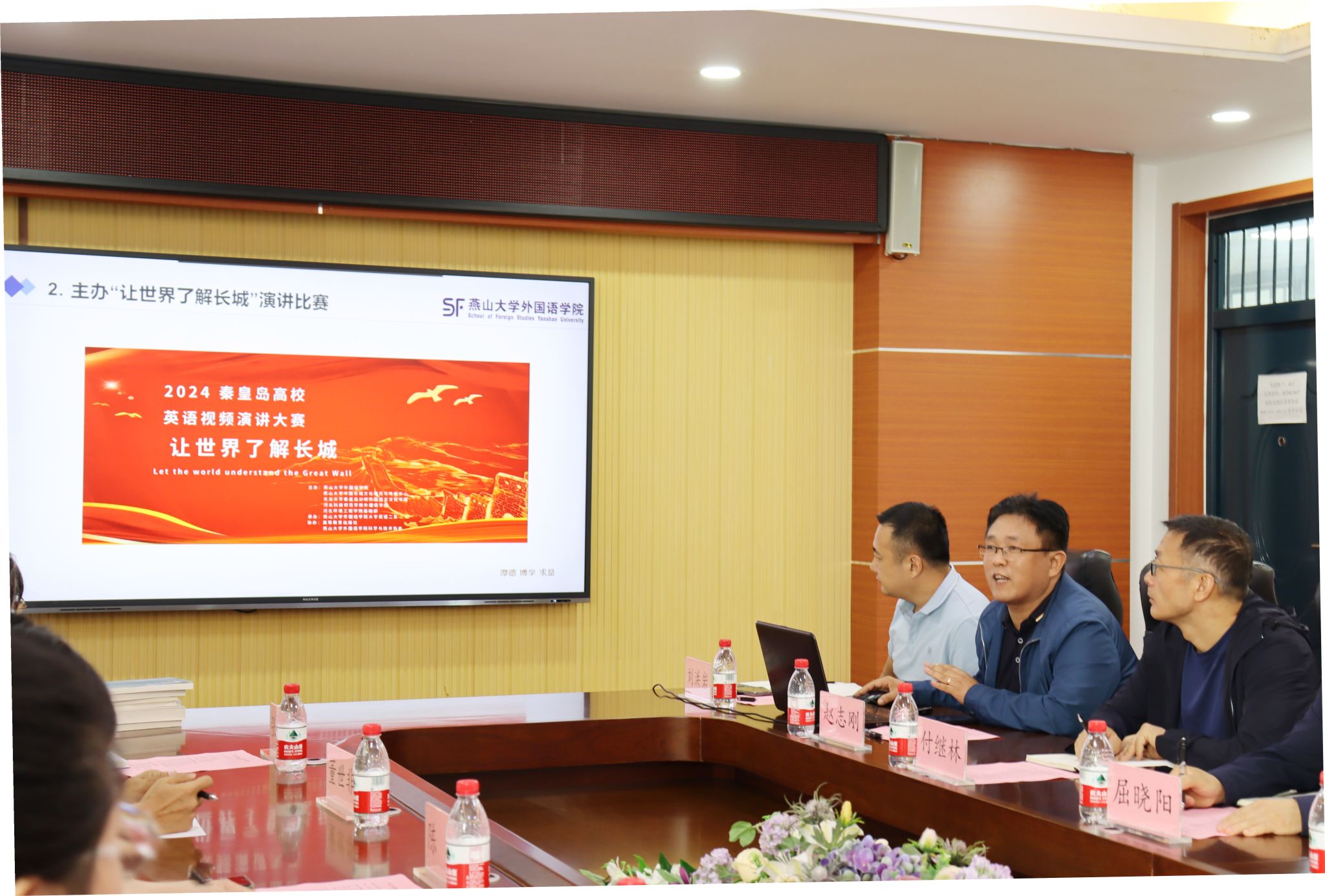 副院长赵志刚从七方面对“用外语讲长城文化”系列教学科研成果进行了汇报:涵盖了翻译《长城:追问与共鸣》、主办“让世界了解长城”演讲比赛、河北省高等学校外语微课大赛、全国思政比赛、参加论坛、发表论文、出版教材,并阐述了这些成果在传播中国文化、提升外语教育教学质量方面的贡献以及对未来工作的展望。