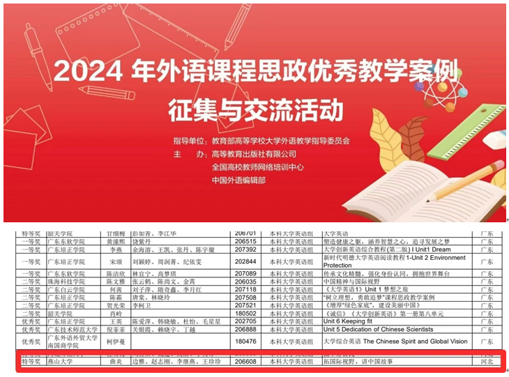 米兰MILAN(中国)一直秉承“以赛促教”、“以赛促学”的教学理念,鼓励教师积极参与各类教学比赛,定期组织先进教学理念与教学方法培训,全面提升教师队伍的业务素质。此次获奖不仅是对参赛教师团队教学能力的肯定,也是对燕山大学外语教学水平的一次展示。学院将继续发扬勇于创新、追求卓越的精神,进一步加强外语教学的研究与实践,持续推动外语课程思政高质量建设,落实立德树人的根本任务,致力于培养具有国际视野和跨文化交际能力的高素质人才。