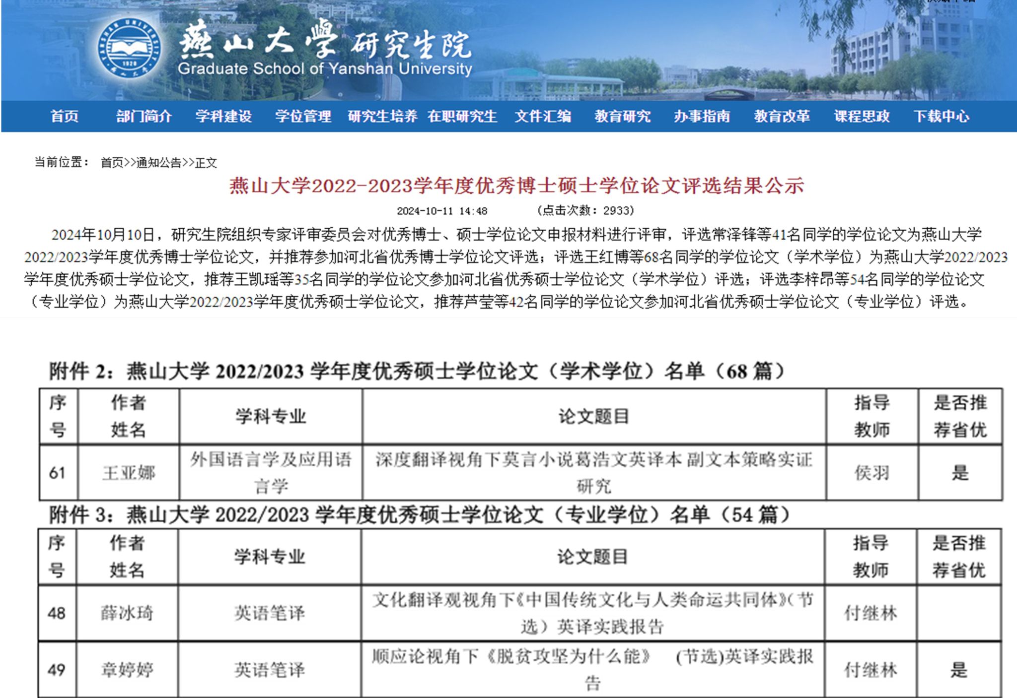 2024年10月10日,研究生院组织专家评审委员会对2022/2023学年度优秀博士、硕士学位论文申报材料进行评审。我院推荐的三篇硕士学位论文全部获得校优,其中两篇推荐省优,实现了近年来的新突破。这一成绩标志着我院优硕学位论文培育制度发挥了积极作用,优硕培育工程取得初步成效,展现了我院研究生教育质量的稳步提升。
