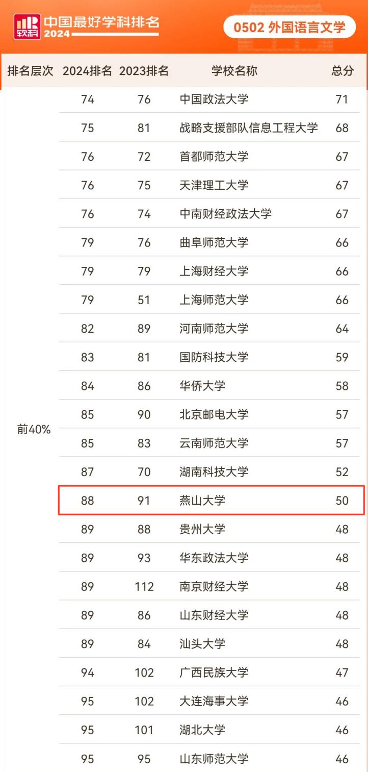 2024年10月15日,高等教育评价专业机构软科正式发布“2024软科中国最好学科排名”。外国语言文学学科共120个高校上榜,燕山大学外国语言文学学科连续三年跻身“软科排名”全国前40%,与2023年相比,前进3名,位列88,居河北省第一位,外国语言文学学科建设取得新突破。