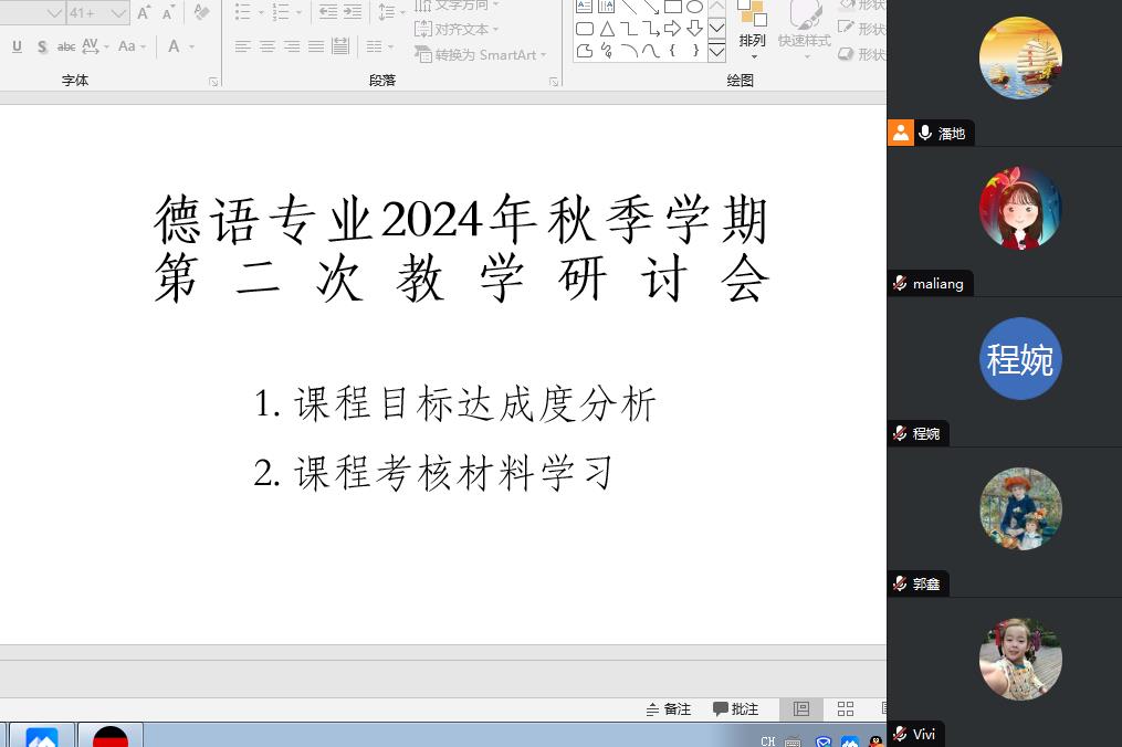 为了优化教学管理、迎接审核评估工作,10月21日,西语系德语专业在腾讯会议平台举办了主题为“课程目标达成度文件讲解及试卷存档管理文件学习”的教学研讨会。本次研讨会由德语专业负责人潘地主持,全体德语专业教师共同参与。研讨会通过深入研讨和交流,为进一步提升德语专业教学质量和管理水平奠定了坚实基础。