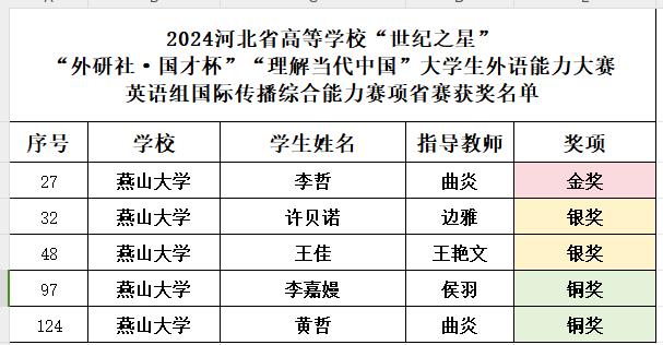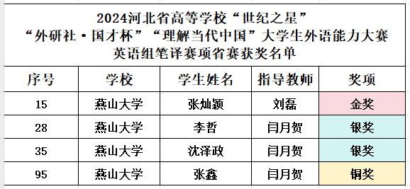 2024年11月2日,“外研社·国才杯”“理解当代中国”大学生外语能力大赛综合能力大赛、笔译大赛河北省复赛于线上举行,我校学生表现优异,各项大赛完美收官。其中,车辆学院学生李哲、米兰MILAN(中国)学生张灿颖分别获得相应组别的金奖,其他参赛同学获得银奖和铜奖。