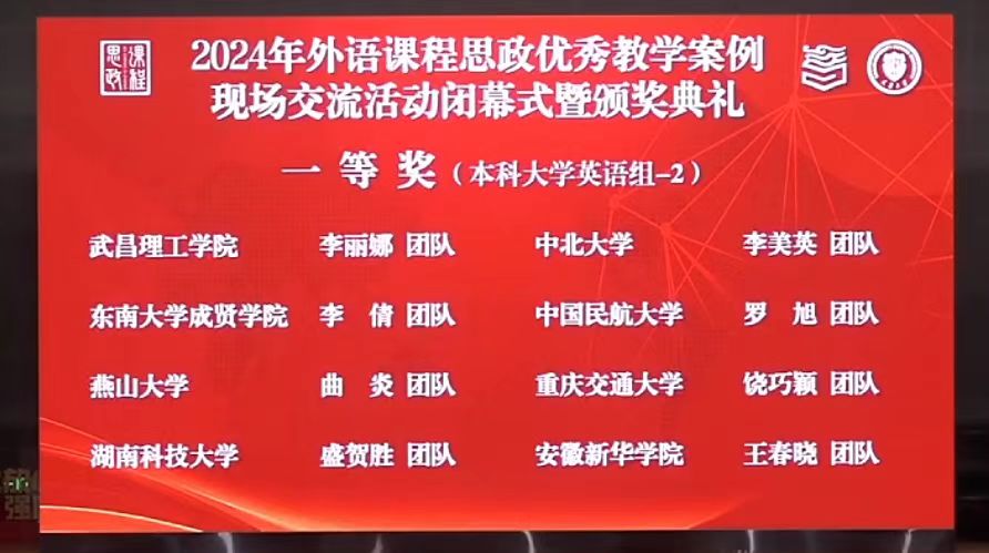 2024年11月17日,“2024年高等学校外语课程思政优秀教学案例现场交流活动”在天津落下帷幕,米兰网页版教师团队(曲炎、边雅、赵志刚、李继燕、王珍珍)荣获本科大学英语组国赛一等奖,继省级特等奖之后再获殊荣。