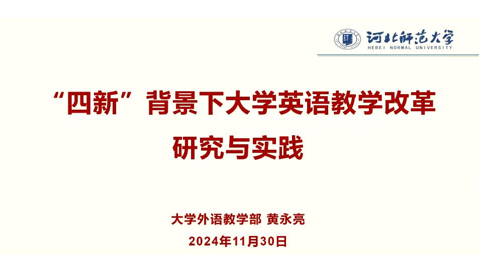 接下来,河北师范大学大学外语教学部主任黄永亮教授做了《“四新”背景下大学英语教学改革研究与实践》的报告,黄教授从“四新”的定义、大学外语教学的核心理念以及大外英语教学改革中的教师角色等几方面介绍了河北师范大学在大学英语教学改革方面的经验和做法。