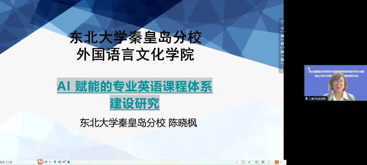 东北大学秦皇岛分校外国语言文化副院长陈晓枫教授做了《AI赋能的专业英语课程体系建设研究》的报告,陈教授从新时代语言专业面临的挑战、语言-英语作为工具的价值、学科交叉融合的探索等角度全面介绍了在人工智能发展的时代,专业英语所面临的形势与改革,并且她以自己创立的英语+智能创新实验班为例,从创班背景、培养目标、培养特色、课程设置、报名方式与选拔机制等五方面介绍了自己的实际经验,为专业英语教学带来了启发。