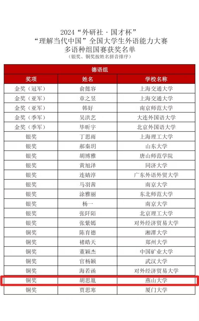 12月7日,由北京外国语大学主办的“外研社・国才杯”“理解当代中国”大学生外语能力大赛(多语种赛)在北京成功举办,我院西语系德语专业的胡思胤凭借出色表现,获得德语组国赛铜奖。在之前结束的河北省省赛中胡思胤同学获得银奖,王艺凝同学获铜奖。