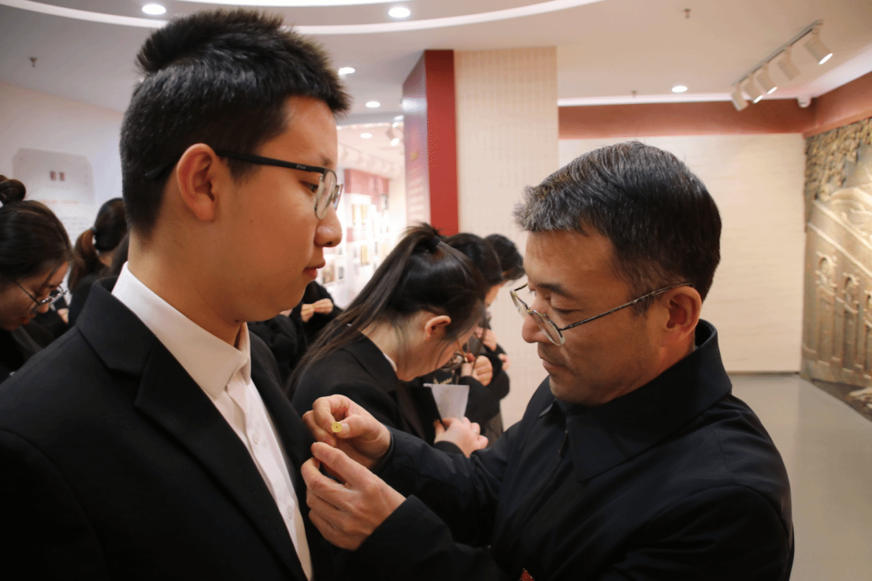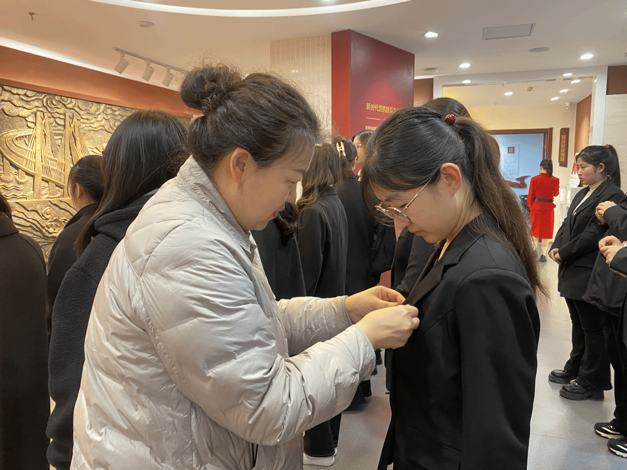 仪式第三项,由院党委书记屈晓阳、院党委副书记夏亮亮共同为24名新发展预备党员佩戴党员党徽并向她们表示了热烈的祝贺。