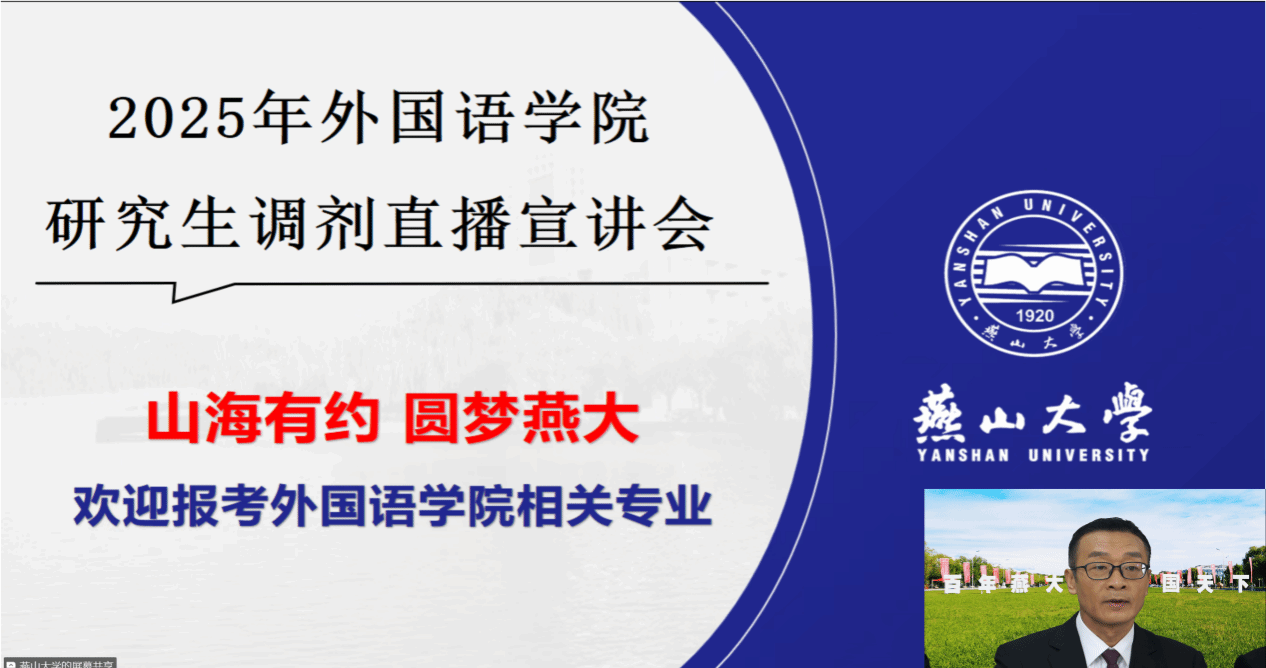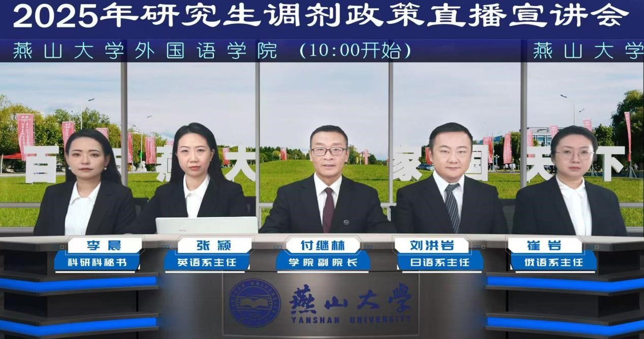 2025年4月4日上午10:00-11:00,米兰网页版2025年研究生调剂直播宣讲会在中国教育在线和掌上考研直播平台顺利召开,直播主场设在世纪楼413会议室。直播活动得到学习强国、百度APP、支付宝校园派、头条搜索、QQ浏览器、搜狗搜索、有道和360搜索等十余个平台的联合推广。直播也同时在燕山大学研究生抖音平台同步开讲。由学院主管研究生培养的副院长付继林、英语系主任张颖、日语系主任刘洪岩、俄语专业负责人崔岩、科研科秘书李晨组成的研究生招宣小组在直播间与考生面对面交流互动,近8000名考生进入直播间听会。