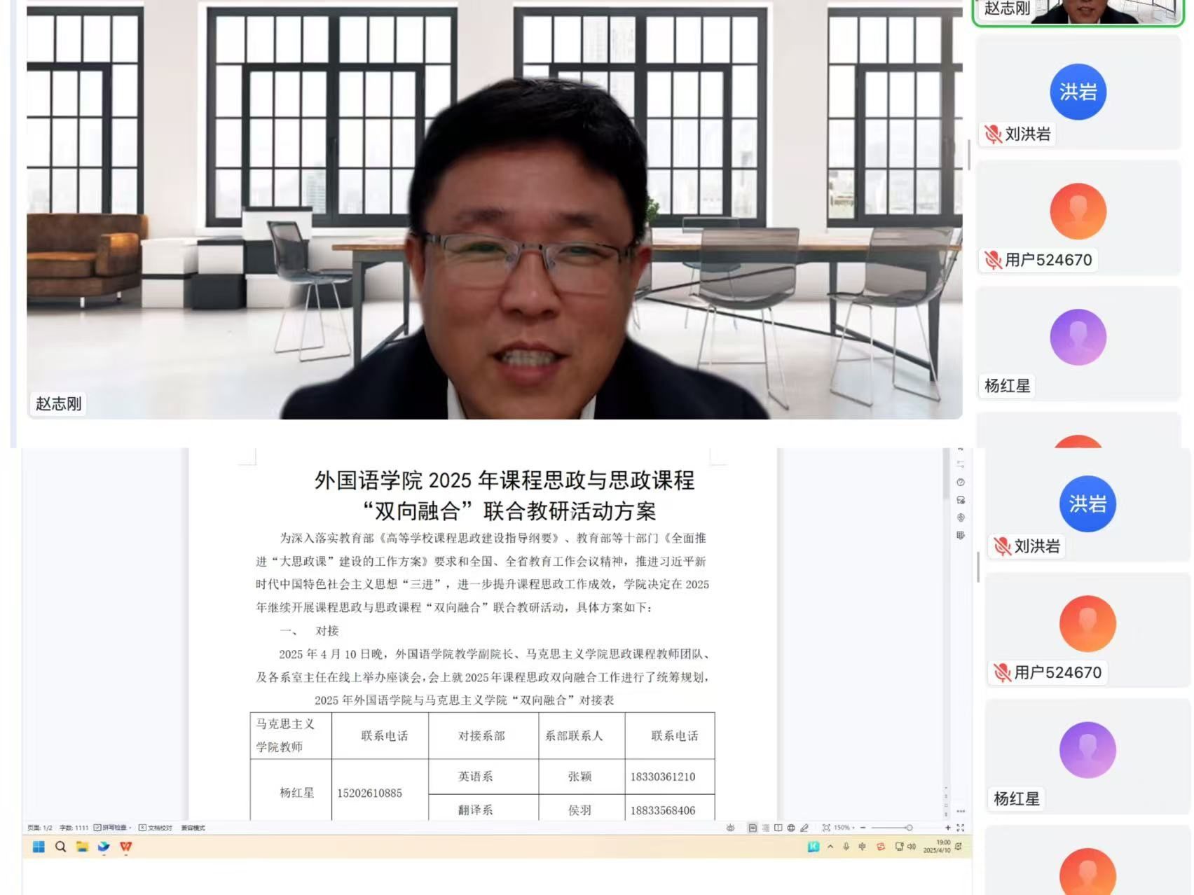 遵照教务处《米兰网页版发布2025年课程思政与思政课程“双向融合”联合教研活动方案的通知》精神,米兰MILAN(中国)与马克思主义学院于2025年4月10日晚,以线上形式召开了对接会议。此次会议汇聚了米兰MILAN(中国)各系室主任及马克思主义学院思政教师团队的精英力量,由米兰MILAN(中国)副院长赵志刚主持。
