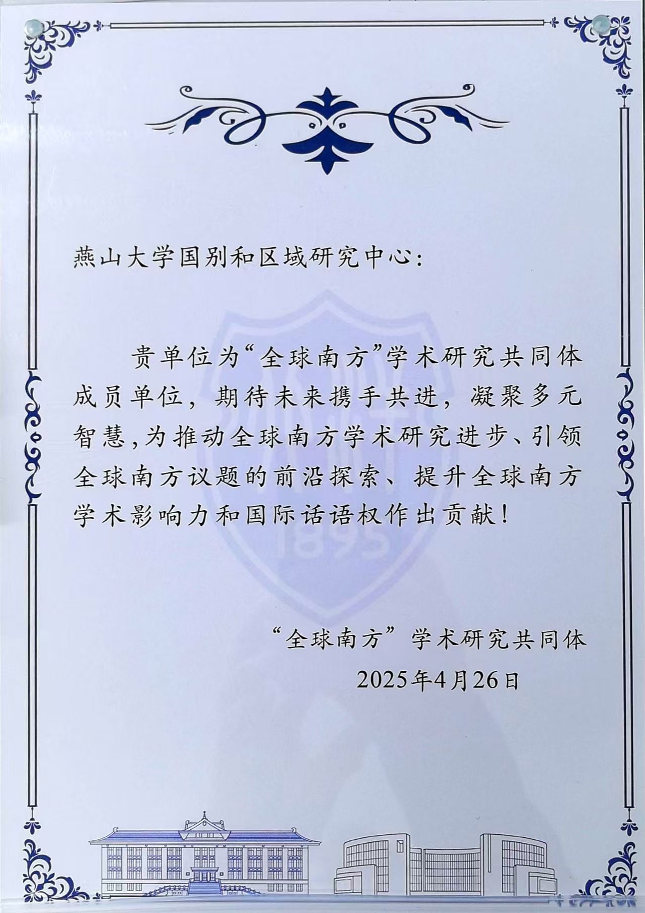 燕山大学国别和区域研究中心证书