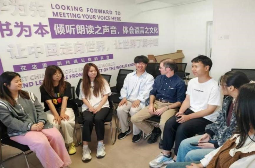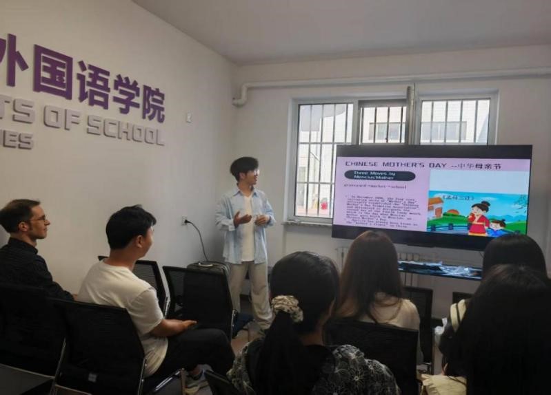 活动伊始,主持人张健以"Today is more than just a date—it’s a global celebration of love!"点燃现场氛围。并对特邀嘉宾Mr. Faires进行介绍。这位幽默的美籍教师并未直接开讲,而是抛出一个问题:“Why do Americans write‘Thank you, Mom’instead of buying expensive gifts?” 围绕这一话题,同学们纷纷用英语表达观点,Mr. Faires则化身“语言教练”,同学们得以在交流中纠正发音、拓展词汇。
