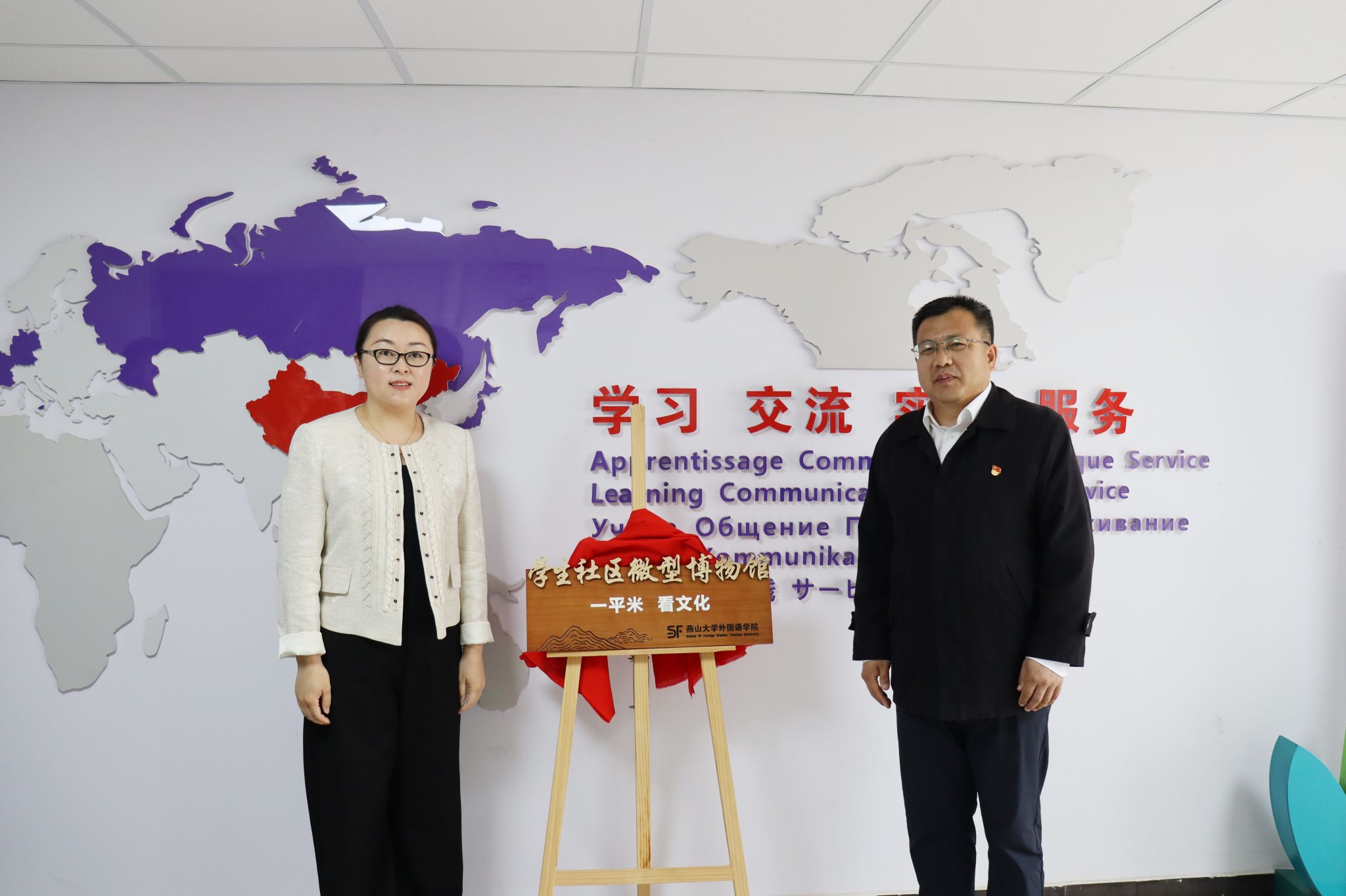 随后,校党委副书记蔡星周、秦皇岛博物馆副馆长孙昕一同为“一平米 看文化”学生社区微型博物馆揭牌。"实体展陈 +数字云听+ 多语种解说"三维育人体系的正式启动,不仅打破了传统博物馆的空间桎梏,更是在学生社区中种下了一颗文化的种子,让文化育人突破了课堂的藩篱,真正实现了"历史在身边"的沉浸式、可触摸的文化体验。