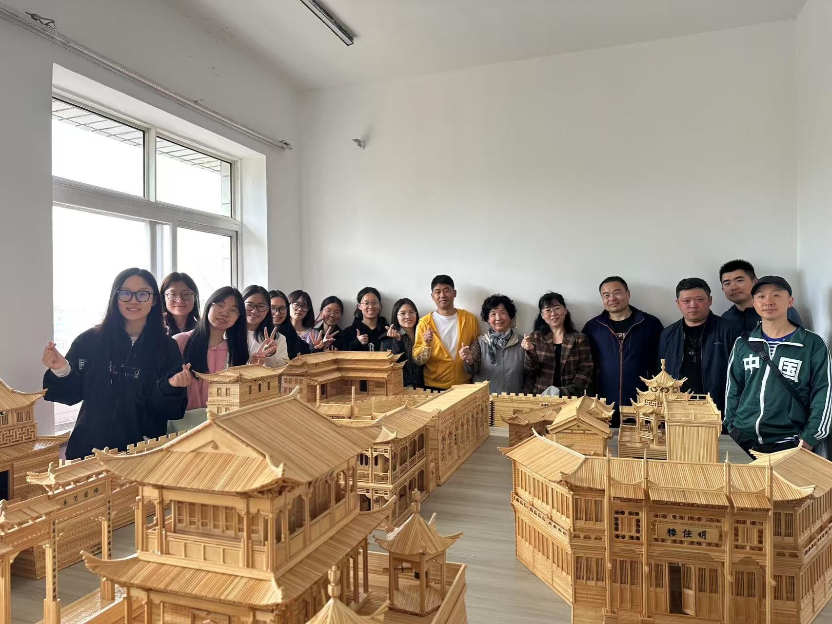 随后,师生们来到了张旭亮老人的无声竹艺工作室。张旭亮老人是一位聋人艺术家,他的竹艺作品摆满了整个屋子。这些作品生动还原了山海关古城建筑,其精细程度令人叹为观止。城楼与城墙之间的部件可以拆卸,楼门被设计成灵活推拉的样式,甚至连城墙上的花纹都是张旭亮老人巧妙设计而成。尽管语言不通,但张旭亮老人通过精湛的竹艺作品与师生们进行了一场无声的交流。他向大家展示了作品的细节,并用手语和表情讲述创作过程中的挑战与克服的困难,传达了对传统工艺的热爱。师生们被老人的专注与热情深深感染,对他的作品赞不绝口,同时也对手语作为沟通桥梁的力量有了更深刻的认识。