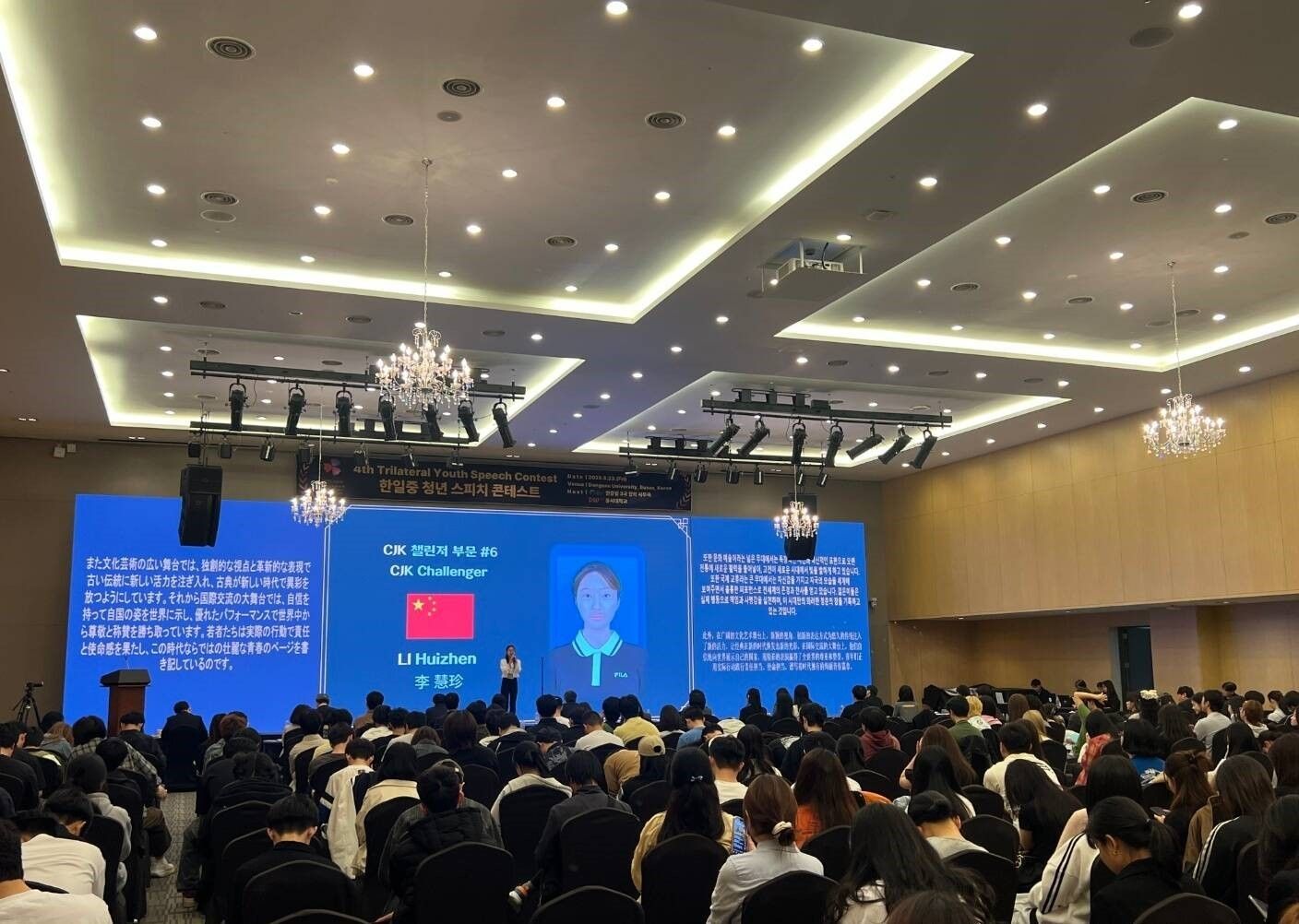5月23日,由中日韩合作秘书处主办的第四届中日韩青年演讲比赛的决赛在韩国釜山举行。中国驻釜山副总领事于瓅斐、日本驻釜山副总领事长渕宪二、中日韩合作秘书处秘书长李熙燮出席开幕式。本届比赛以“今天的合作,未来的发展:中日韩交流的故事”为主题,汇聚中日韩三国青年代表聚焦区域合作,分享民间外交故事。我院李慧珍同学在数百名选手参加的预赛角逐中胜出,作为我国4名青年代表之一,在决赛中发表精彩演讲,演讲内容展现了我国当代青年对中日韩合作的见解与担当,最终获评优秀奖。