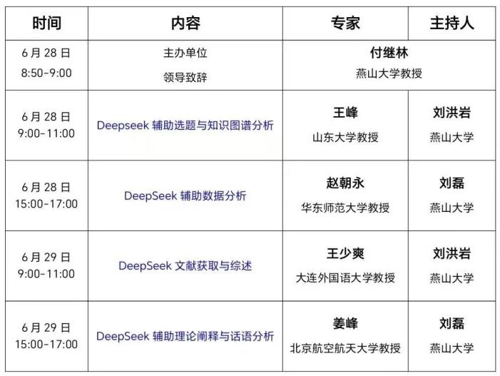 本次研修聚焦如何运用deepseek大语言模型辅助CSSCI论文的写作与发表,围绕如何选题、文献综述、数据分析(话语分析)、理论阐释等论文写作的核心环节,旨在提升社会科学研究者的学术写作能力。燕山大学客座教授、山东大学教授王峰,华东师范大学外语学院副院长赵朝永教授,大连外国语大学高级翻译学院副院长王少爽教授及北京航空航天大学姜峰教授四位教授受邀担任主讲嘉宾,围绕以上议题展开深度探讨与分享。米兰网页版副院长付继林教授做了开幕致辞,刘磊副教授与刘洪岩副教授担任主持人,确保研修班议程高效推进。