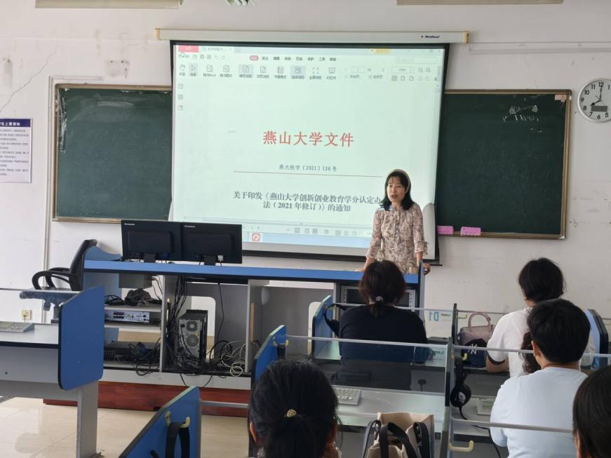 随后,程婉老师围绕第二课堂育人体系,简要介绍了双创学分的构成与获取途径,重点强调学科竞赛、科研项目、创新创业实践等模块对提升综合能力的价值。她通过展示往届学生在"外研社·国才杯"德语演讲比赛、"互联网+"大赛等赛事中的获奖成果,鼓励新生积极参与专业实践,在探索中明确发展方向。