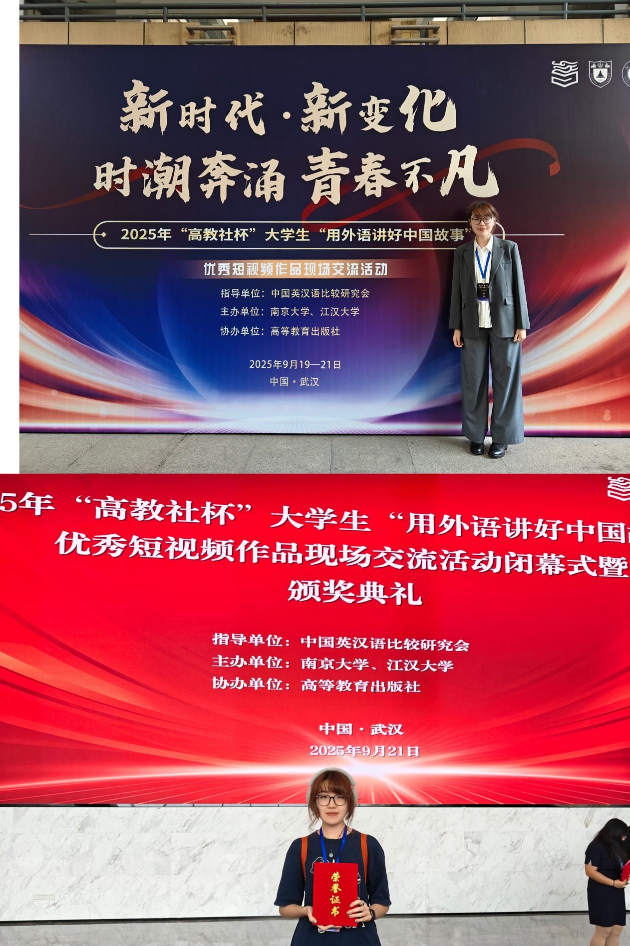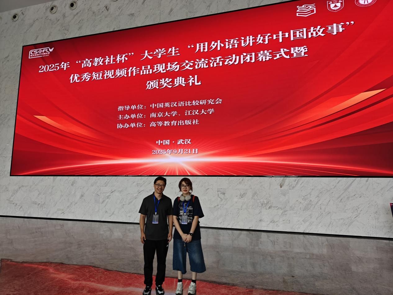 9月19日至21日,2025年“高教社杯”大学生“用外语讲好中国故事”优秀短视频现场交流活动在武汉市江汉大学举行。我校学生陈盼雲团队(成员:谢子晗、张丹、王利丹、王睿焬)凭借作品Coded Echoes of Home(码上乡音)入围全国赛,比赛现场通过米兰MILAN(中国)学生谢子晗代表团队的精彩展示,荣获全国一等奖,张宇老师荣获“优秀指导教师”称号,创造历史最好成绩。