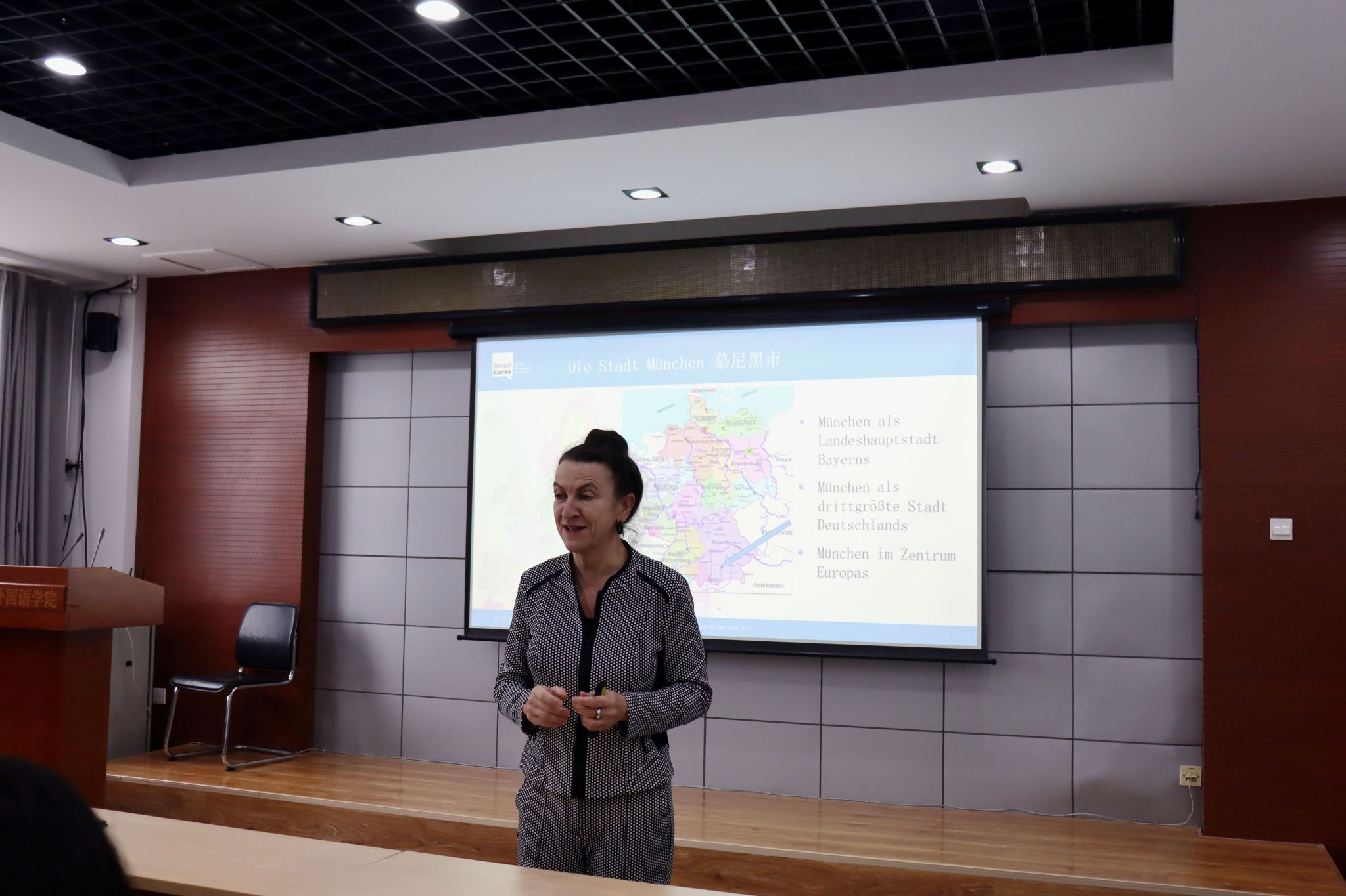 摩尔博士在人文馆416报告厅为德语系学生带来了主题为“德语语言学习价值与德语人才发展前景”的主题宣讲。讲座围绕慕尼黑城市文化、留学生活规划以及中德合作项目的发展前景展开,内容丰富、生动有趣。她以轻松幽默的语言与学生们热情互动,现场气氛融洽,同学们踊跃提问,展现出积极向上的学习热情与优异的德语表达能力。