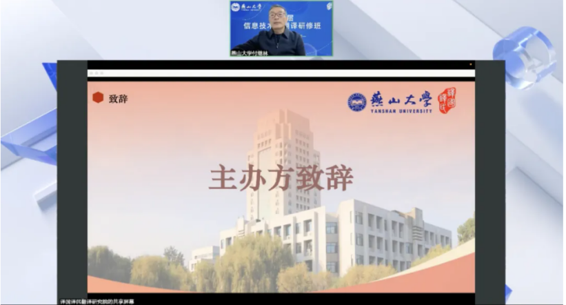 副院长付继林在开幕致辞中对参会的专家学者与同仁表示欢迎,并系统介绍了燕山大学的历史积淀、学科优势和办学成就以及米兰MILAN(中国)在学科建设、科学研究等方面取得的亮点成果。他指出,在信息技术爆发式增长的时代背景下,翻译行业的信息化、智能化转型已成为不可逆转的趋势。本次研修班正是为了顺应这一大势,为广大从业者提供前沿知识交流平台,助力把握转型方向,提升技术应用能力,共同推动翻译研究与实践的高质量发展。