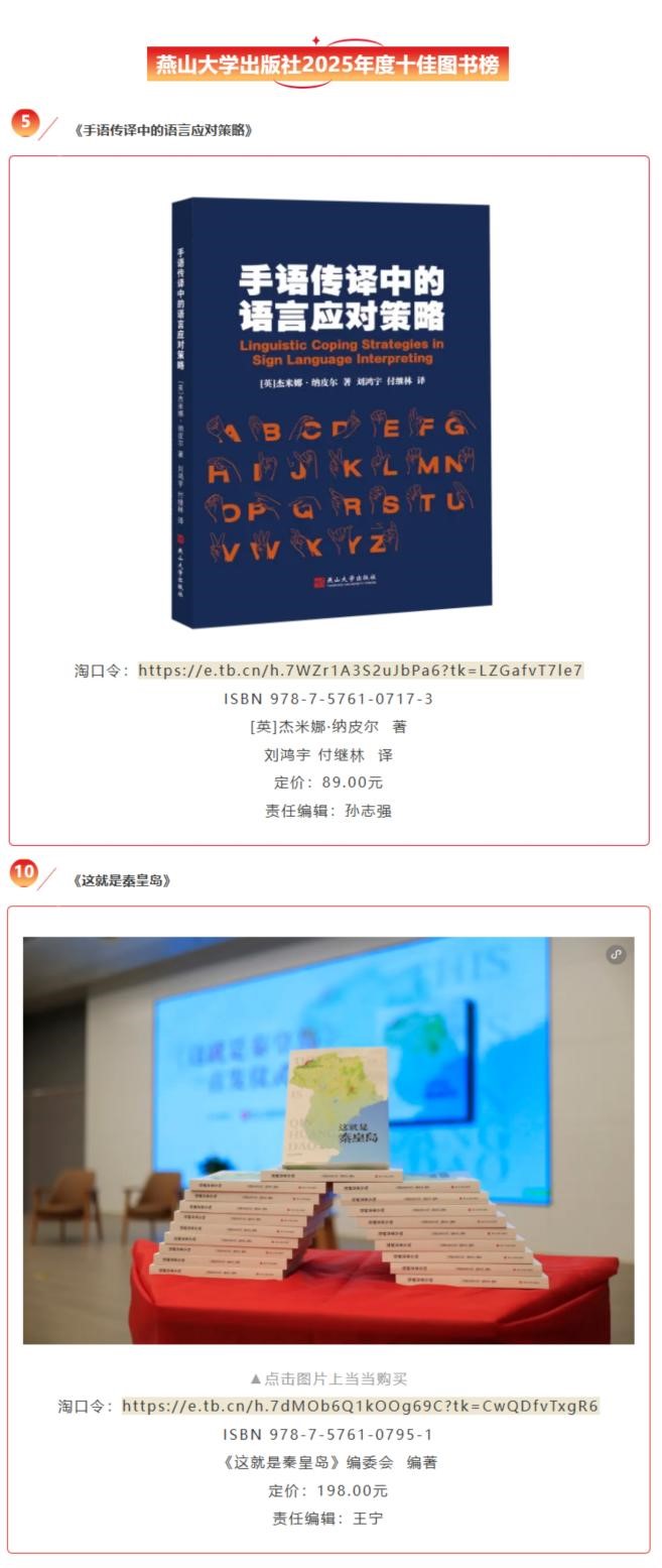 经过为期一周的公众网络投票和由出版界、学术界专家组成的评审团的多维度综合评议,由燕山大学出版社组织的“2025年度十佳图书”评选结果于近日公布。米兰网页版的两部优秀著作《手语传译中的语言应对策略》与《这就是秦皇岛》从全社年度出版的近200种图书中脱颖而出,成功入选最终十佳榜单。这一成果集中体现了米兰MILAN(中国)在学术翻译、跨文化传播与服务地方文化建设领域的扎实功底与突出贡献,彰显了学院在教学科研产出与出版社精品战略的高度契合,获得了学界、业界与广大读者的广泛认可。