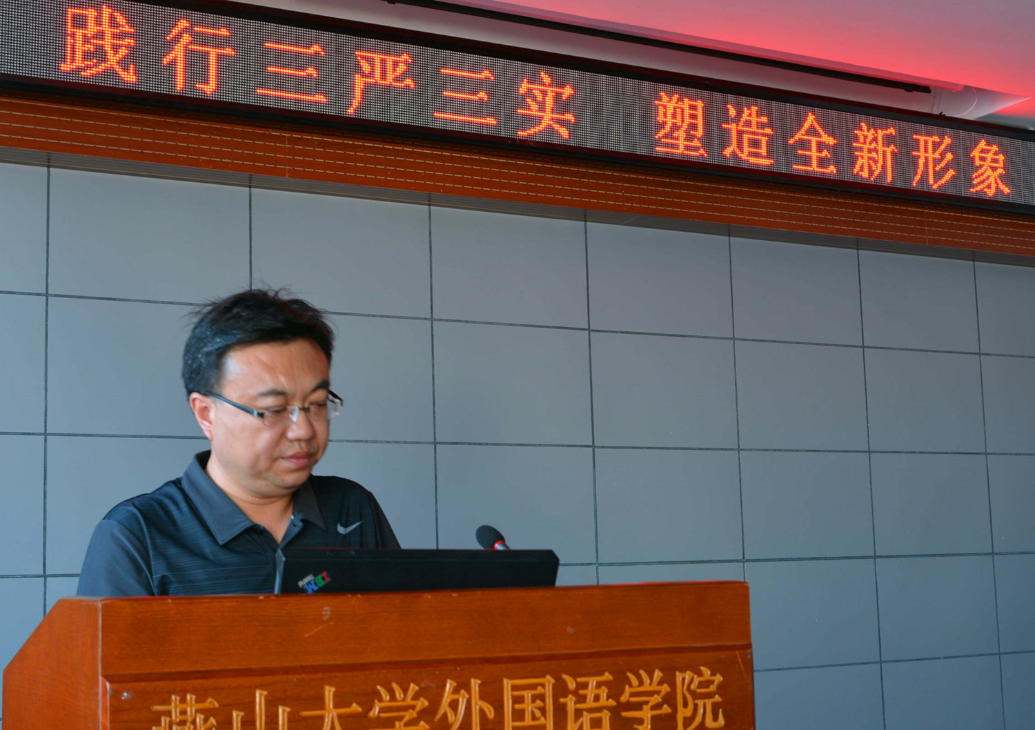 6月18日下午4点15分,我院在人文馆416举办了“三严三实”专题党课讲座,严冰书记为全体教工党员做了题为“践行三严三实,塑造全新形象”的讲座。