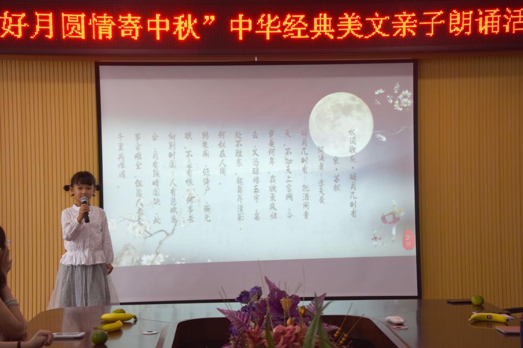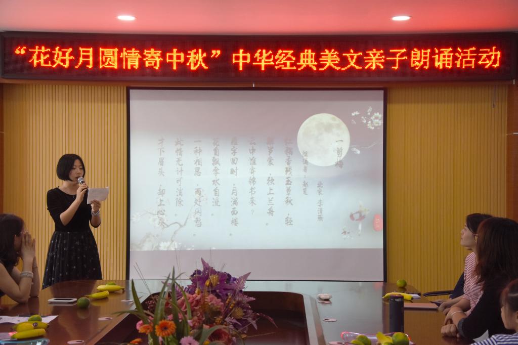 9月20日下午,米兰MILAN(中国)的老师和孩子们在417欢聚一堂,这里花果飘香、诗声朗朗,米兰MILAN(中国)“花好月圆情寄中秋”中华经典美文亲子朗诵活动正在这里举行。此次活动由办公室主任姜炼主持,党委书记严冰和工会主席付继林到场为活动献辞。