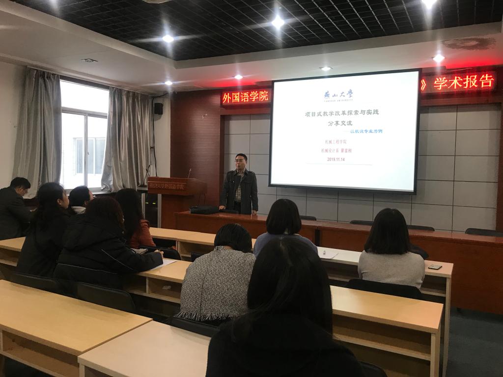 报告主讲人翟富刚,是我校机械工程学院机械设计系副主任,主要负责该系本科教学及日常管理工作。翟富刚结合机械设计系10多年来的项目教学实践发展历程,阐述项目式教学不同阶段遇到的问题、改革处理措施以及成效,重点介绍基于课程项目群的项目式教学体系建设方法,探讨培育精品项目的本科教学实施办法。报告会上,我院教师和翟老师针对三级项目的选题来源、三级项目课程的时间安排、项目如何与课程相结合等问题进行了热烈的讨论。