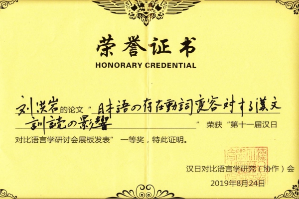 此次研讨会由学术沙龙、分科会、博士论坛和报告会等构成,共计百余名国内外专家学者在会上交流日语语言学相关的学术热点问题。我院教师刘洪岩的论文因在方法论和结论上极具创新性,故荣获“第十一届汉日对比语言学研讨会展板论文”一等奖。这一奖项对刘洪岩老师的教学及研究成果给予了高度肯定。