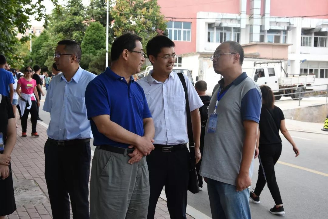 (校长刘宏民(左二)向学院党委副书记王兵(右二)和院学生科科长王景琳(右一)了解迎新情况)