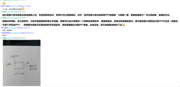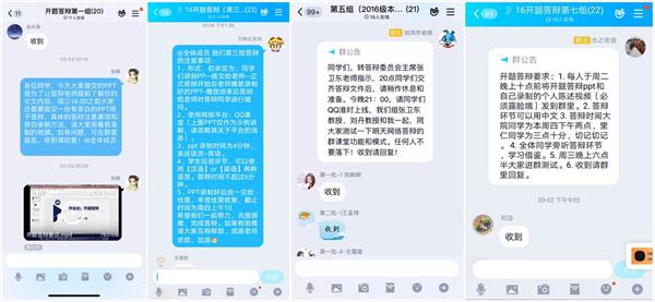 为了保证线上答辩的顺利进行,8个答辩小组建立了师生联络QQ群,针对可能出现的网络卡顿、部分学生没电脑等问题提前做了周到安排,答辩前答辩秘书组织学生进行了设备调试和演示(见图2)。张颖老师制作了“开题答辩要点”视频,帮助学生了解开题答辩流程及PPT旁白录制方法(见图3)。通过测试,决定使用腾讯课堂、腾讯会议、QQ群课堂等工具进行线上答辩。