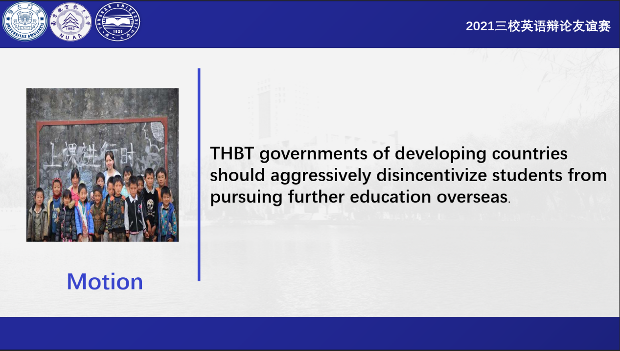 本次三校英语辩论友谊赛旨在吸引更多的同学关注英语辩论,浓厚我校英语学习氛围,为我校英辩选手积累宝贵经验,同时通过此次校际交流,积极互动,资源互通,取长补短,共同进步。以赛促学,提高用英语思考探究问题、多角度分析和解决问题的能力,通过辩题(Motion)引导学生对国际热点和多元文化进行讨论,为塑造具有跨文化素养和能力的国际化人才做出外语学科的贡献。