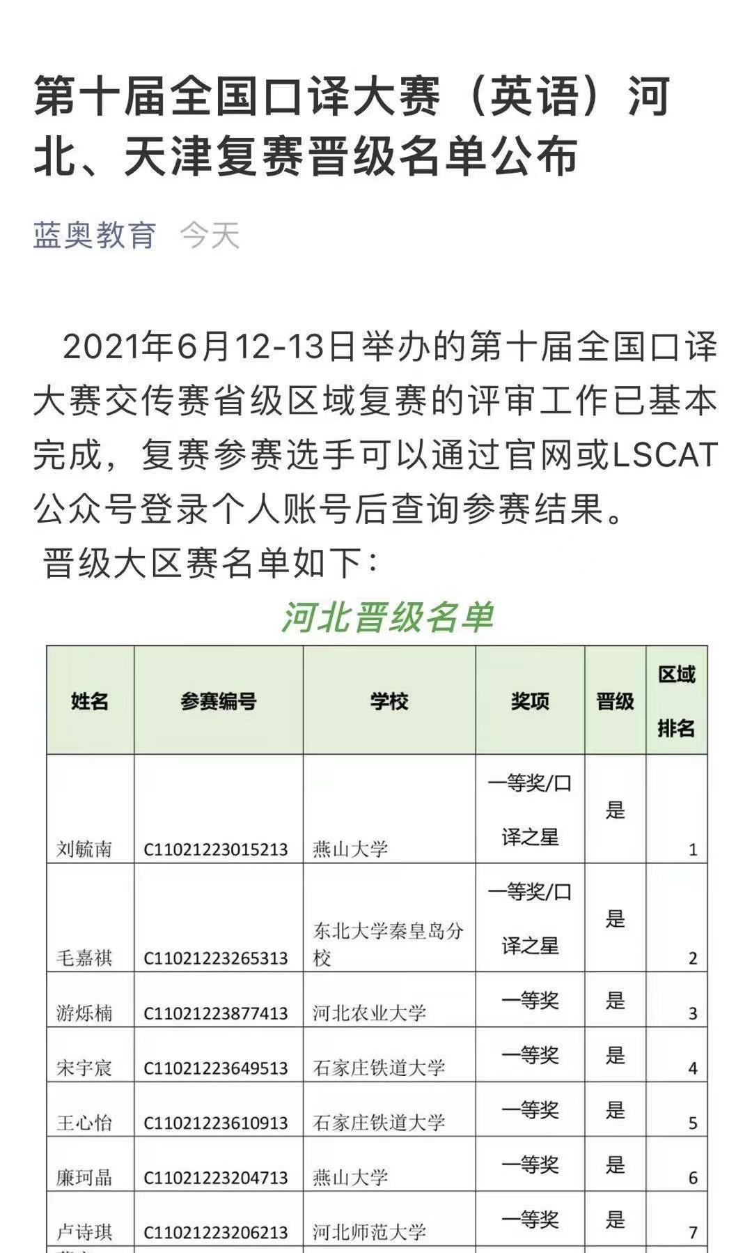 第十届全国口译大赛交传赛(英语)河北赛区复赛于2021年6月12-13日成功举办。本次大赛由中国翻译协会主办,译协语言服务行业创新中心、北京甲申同文翻译公司承办。我院张燕彬、李秀梅、张颖三位老师组成的指导团队带领经过初赛选拔和专业培训后入围的英语专业8名学生,与来自河北省多所高校的参赛选手们进行角逐。经过激烈比赛,刘毓南(英语19级)荣获一等奖并获得“口译之星”称号,廉珂晶(英语18级)荣获一等奖,张正(英语17级)荣获二等奖、许靖安(英语19级)、吴竞择(英语18级)、耿奇(英语18级)荣获三等奖,李晓娟(英语17级)、黄晨璐(英语17级)获得优秀奖。张燕彬、李秀梅、张颖老师获优秀指导教师奖。刘毓南、廉珂晶、张正、许靖安、吴竞择、耿奇六名同学将于今年9月代表河北省参加华北大区赛。