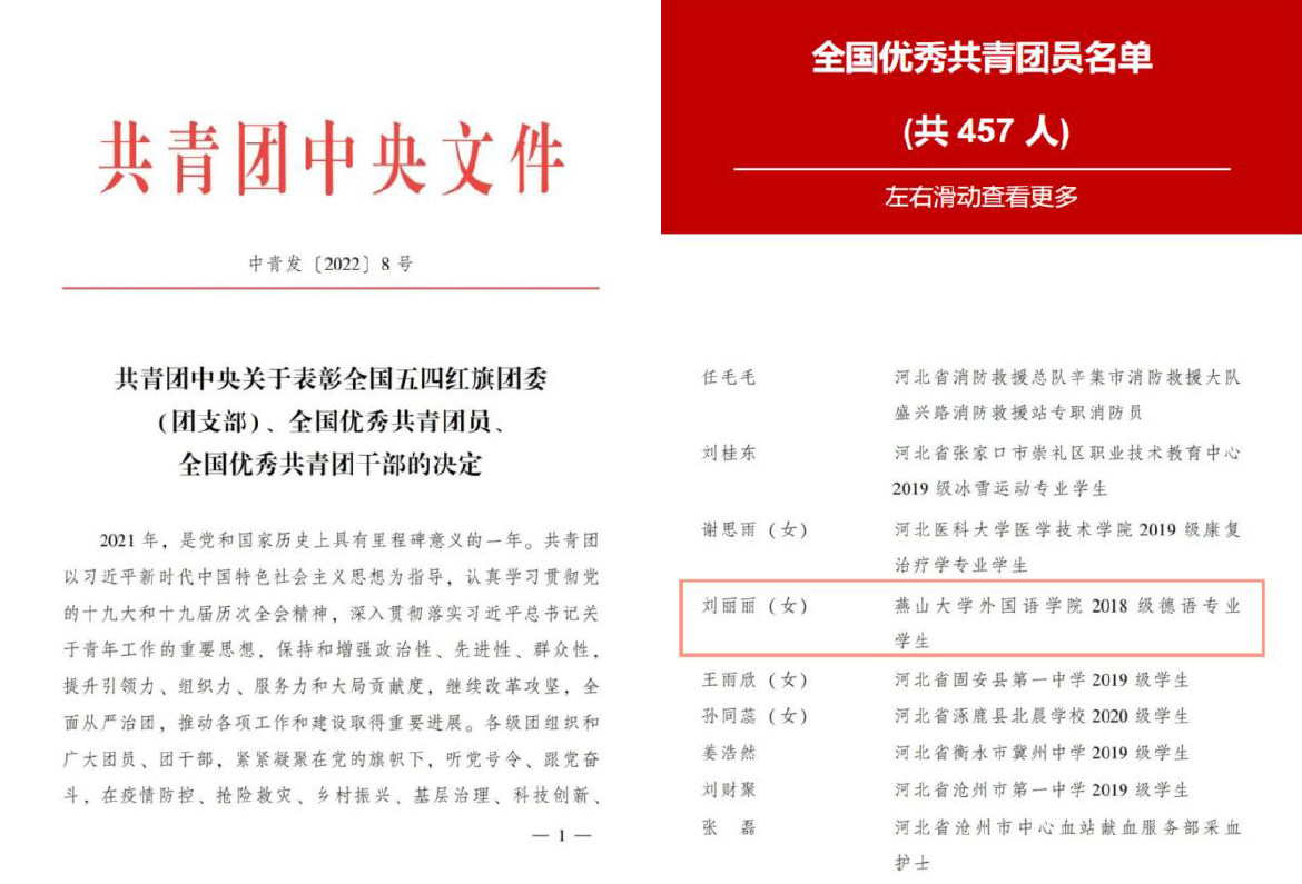 近日,团中央下发《表彰全国五四红旗团委(团支部)、全国优秀共青团员、全国优秀共青团干部的决定》,我校米兰MILAN(中国)学生刘丽丽被授予“全国优秀共青团员”荣誉称号。自2月开始,团中央启动全国“两红两优”评选活动,评选出了一批在抗击疫情、乡村振兴、科技创新、服务冬奥等方面表现突出的先进集体和个人。全国共有457人在此次表彰中获得“全国优秀共青团员”称号,刘丽丽是河北省2名获此殊荣的高校本科生之一。