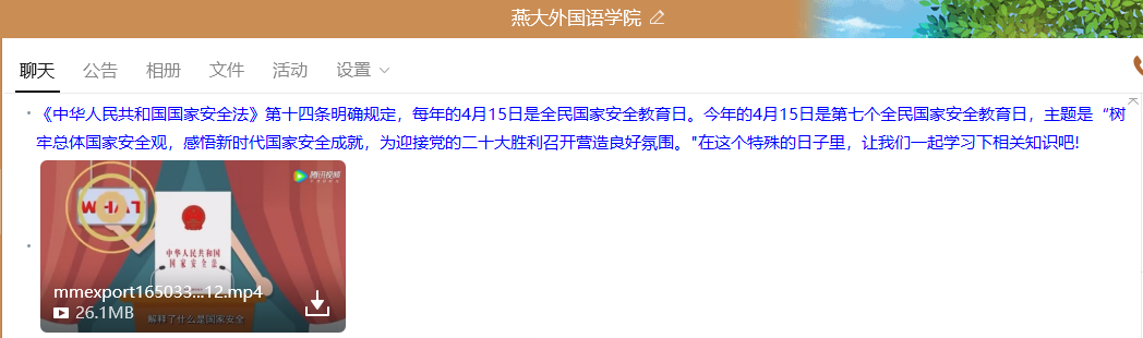 学院在严格落实疫情防控措施的前提下,采取线上为主方式开展了为期一周的国家安全知识宣传系列活动。利用学院网站制作宣传图片;通过微信公众号发布相关政策、法规及安全知识;通过学院QQ教工群推送相关视频资料;组织全院教工参加全民国家安全教育日宣传教育专项答题活动;开展主题班会活动。