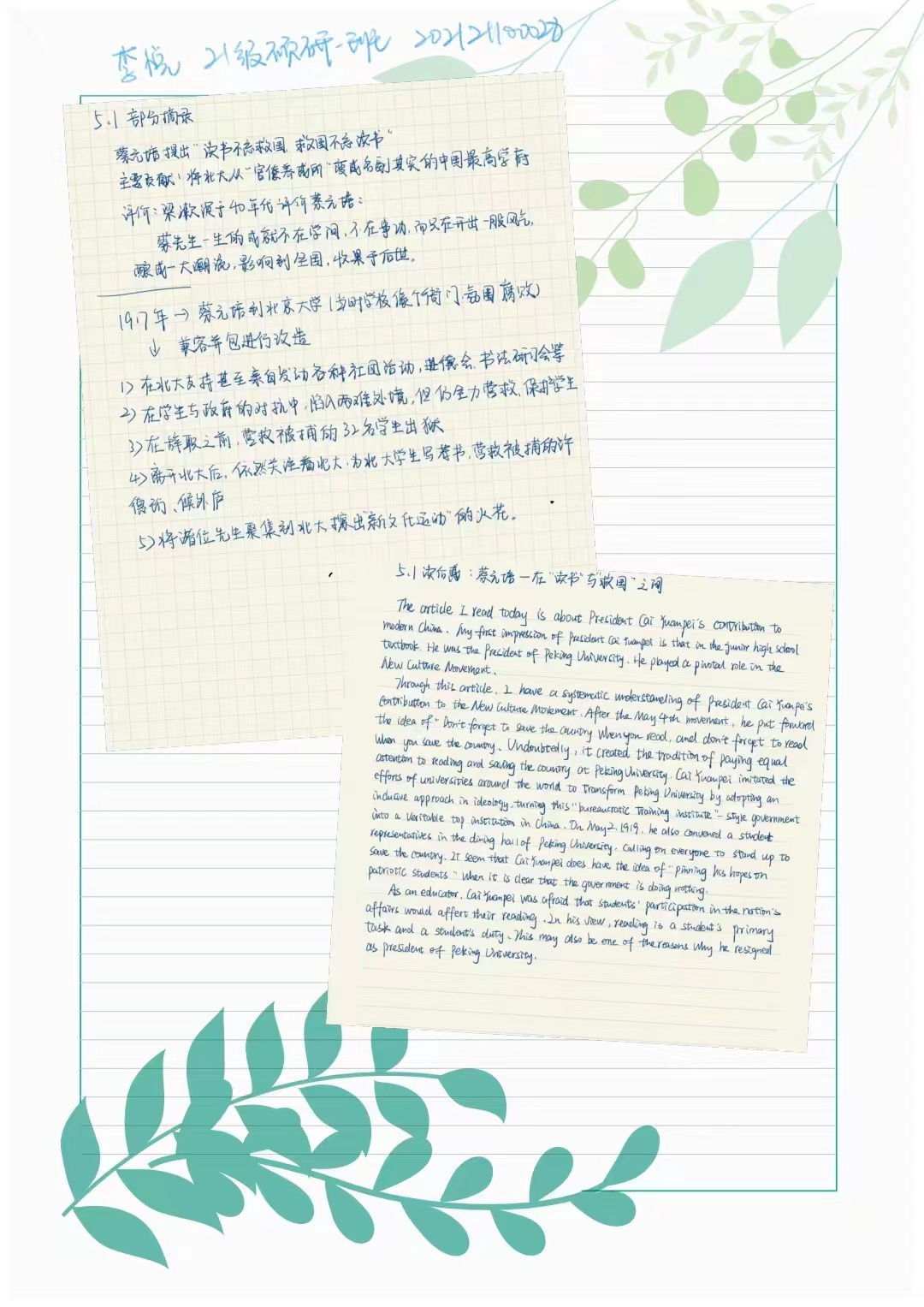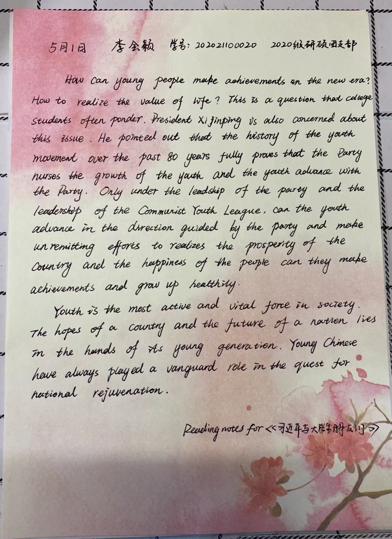 “颂经典红歌,谱百年华章”合唱活动主要面向2021年级,因为活动于线上开展,同学们沟通交流的不便,合唱有一定的局限性。但同学们完成了挑战,克服了困难,顺利完成了十首合唱作品。“弘五四之精神,正青春之能量”寻找身边正能量摄影及视频作品征集活动主要面向2020级,活动共收到十四份作品,其中包括七条视频和七份摄影作品。这些作品通过不同的场景和素材,多方位地展现了当代青年大学生自信风采和朝气蓬勃精神风貌。读书笔记征集活动共收到五十六份个人作品。同学们将本专业知识与五四精神结合起来,用不同语言书写青春感悟。青年以笔书理想,以字证担当。读书笔记虽短,道不尽青年“使命在肩,奋斗有我”的爱国情怀。