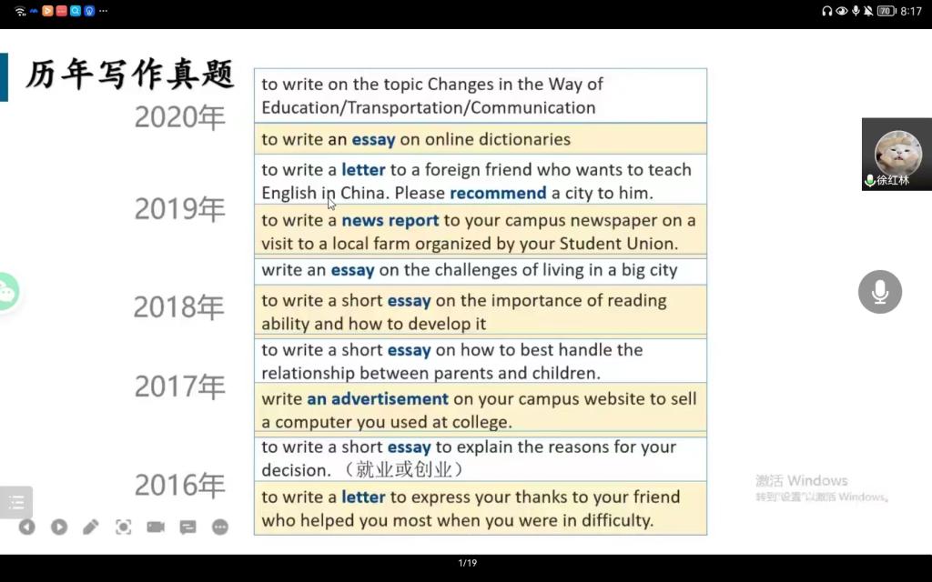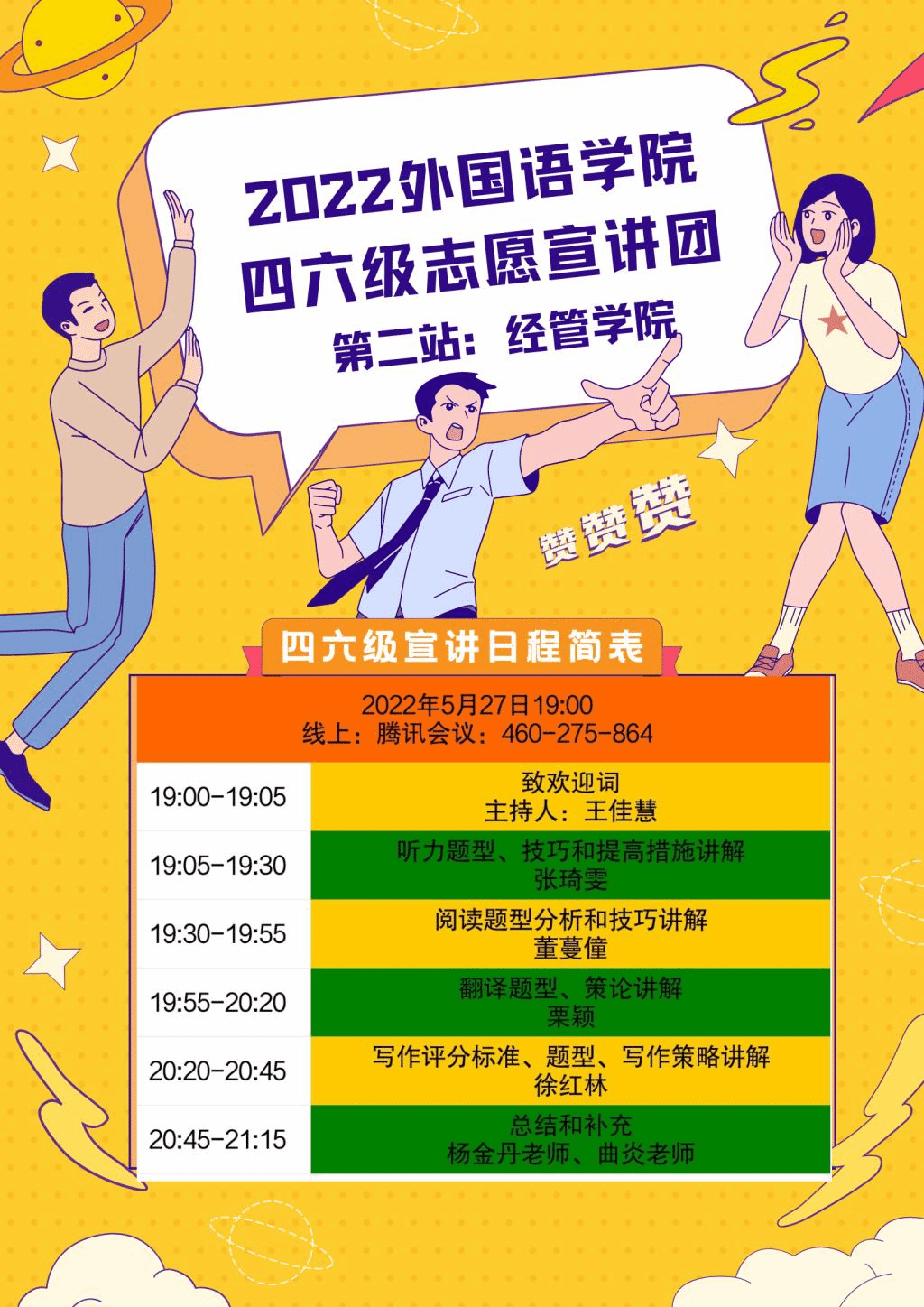 在文法学院以及经管学院的协助下,本学期四六级宣讲活动分别于5月20日、5月27日以线上形式举办两场讲座。虽然举办形式受限,但老师们和同学们的热情丝毫不减。两次宣讲共计约500人参加,宣讲志愿者以及点评教师紧密结合真题以及考试最新动向,分别从听力、阅读、翻译、写作四个方面生动讲解,细致分析,充分调动了同学们的积极性,为同学们备考四六级给予了方向上的引导以及应试细节上的指导,也让本次宣讲获得了师生一致好评,特别是公共英语教学第二党支部的李继燕老师、边雅老师、杨金丹老师以及曲炎老师四位优秀英语教师的总结补充,让同学们豁然开朗。
