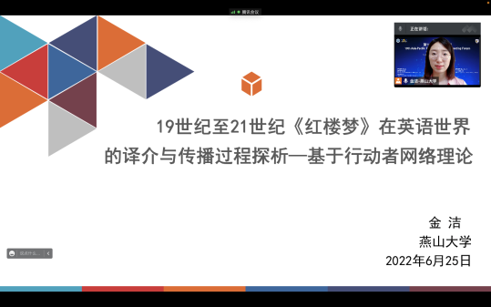 在“”翻译国际传播中的合作研究”分论坛中,金洁博士基于行动者网络理论,探索19-21世纪《红楼梦》在英语世界的译介与传播过程,认为各个行动者(人类行动者或非人类行动者)在目标文学场域内共同合作构建与运作翻译网络是翻译产品产生、传播和接受的关键。