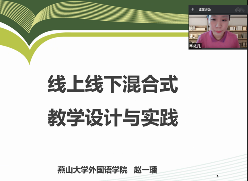 赵一璠老师主持“语音”课程混合式校级教改项目、基于“转动课堂”的大学英语视听说混合式省级教改项目1项,主持省部级哲学社会科学研究课题2项。她从混合式教学过程、线上资源库建设和教学心得三方面,由浅到深地分享了混合式教学的实际经验和具体做法。她提出,混合式教学设计是基于“以学生为中心”教学理念、针对学生学习成效开展“课堂教学内容做减法、课堂教学效果做加强法”的一种教学设计,有助于满足学生个性化学习需求,并助力教师成为学生学习的促进者。