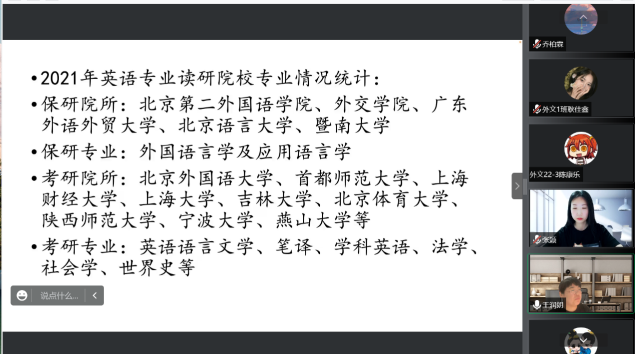 外语专业讲座由张颖老师和王润朗老师主讲,两位老师围绕专业认知与就业前景、外语专业知识体系的构建、外语专业学生人文素养和思辨能力的培养等内容展开,介绍了外文专业的主要课程以及对口工作,深入分析了近年来的就业情况和考研趋势,对同学们的个人职业规划和人生规划有所启发,给同学们提供了宝贵建议。