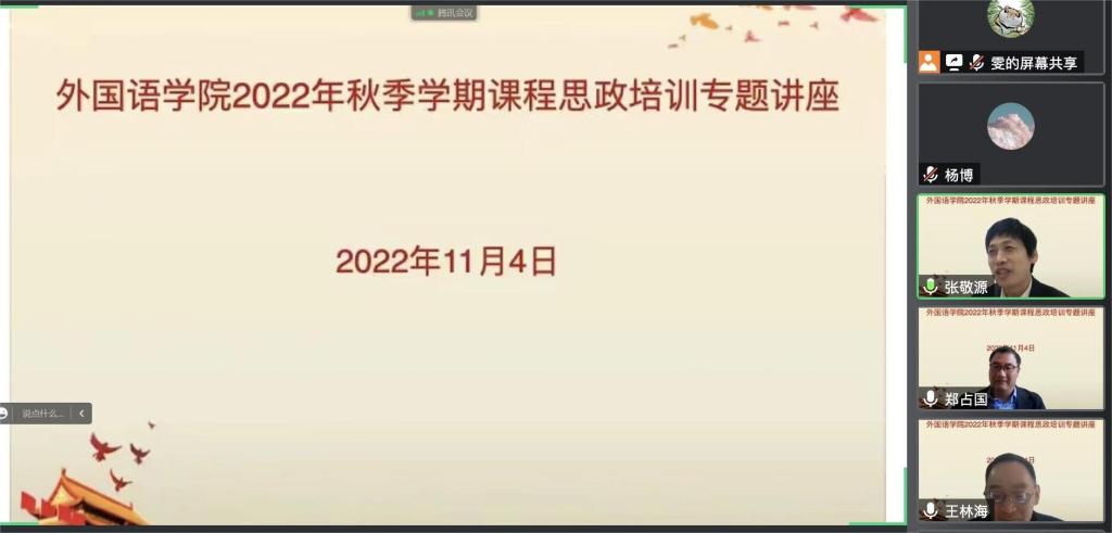 之后郑占国副院长分别对两个讲座进行了总结和点评,他强调,在英美文学课程的教学中,要从语言翻译、作品背景、作品主旨等多方面来挖掘课程思政的因素,重视对思政过程与结果的评价,呼吁教师们要认真思考思政教学中每一环节,终身学习、不懈探索,持续提升自己的素养,发挥教师在立德树人中的重要作用。最后郑占国副院长组织参会教师对主讲教师进行了提问与讨论,参会教师分别从如何有效地评估课程思政的育人效果、如何从“主题和内容”方面进行具有系统性的思政教学的“线性设计”、如何将经典案例做出新意等方面和主讲老师进行了探讨。
